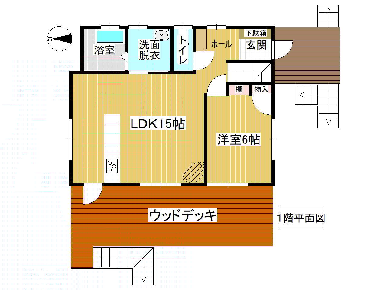 | 設備 | カウンターキッチン・BT別室・庭・ウッドデッキ・給湯・洗髪洗面化粧台・照明器具付き・プロパンガス・上水道・浄化槽・側溝 |